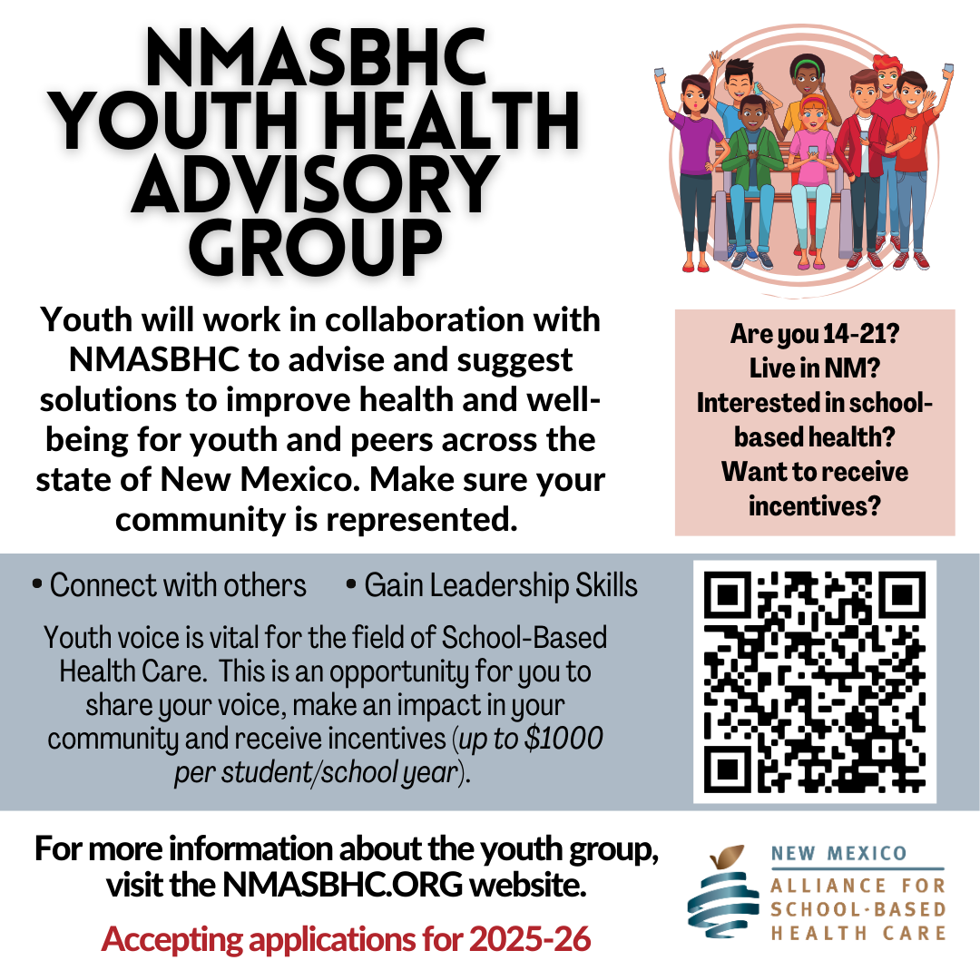 Our mission is to raise awareness about health issues that affect our communities and school-based health care. Youth will work in collaboration with NMASBHC to advise and suggest solutions to improve health and well-being for youth and peers across the state of New Mexico.